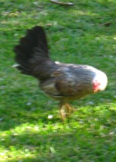 Little children running around laughing and chasing a wild Rooster.