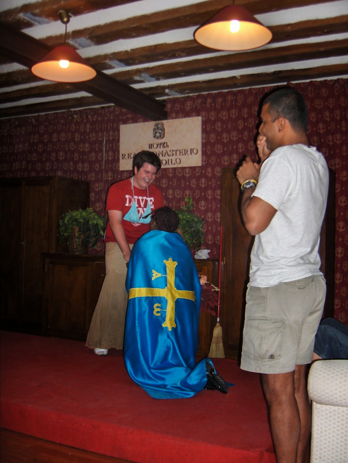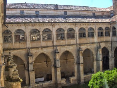 The next morning was four one on ones in a row after breakfast. All four were beautiful young and intelligent Spanish ladies. The last one, I walked to the village with and we ran into Juan and Suchin. We walked to what Juan thought was a water tower and I inquired with a local elderly man who lived next door. Yes it was a water tower. We meandered back for lunch and on the way, Manuela, my one on one and I encountered a Pilgrim on the St James Way. He was from Green Bay, Wisconsin and had walked 1000 Kilometers so far. He was getting college credit for this and was researching Monastic life from the Middle Ages. I invited him to see the Cloisters at the hotel but when we arrived the Front desk manager said he wasn’t allowed unless he was a guest. I explained he was my guest and she allowed him into the Cloisters and the museum. I had a lovely lunch with three Anglo ladies and two of the Spanish ones that I had an earlier one on one with.