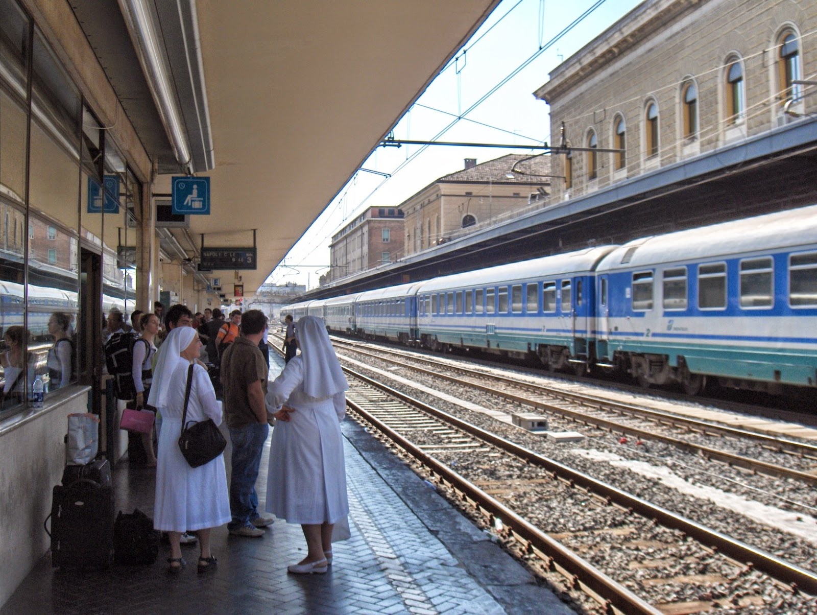 I crossed a different bridge, went through another neighborhood and arrived at the station a little early. Mc Café was calling. I swear they got the best cappuccino in all of Italy for the price. This time it was served in a real cup and they had a lounge like Starbucks, but better. I’ll never bad mouth McDonald’s again. It was so good I had another cup and almost bought a pastry from their amazing selection. I returned to Gate 9. That is where all the schedules said the train was departing from. After waiting until 15:25, I was beginning to worry so ran back to check the sign but it said nothing. I noticed a train getting ready to depart for Bologna on Gate 3 so ran over to the conductor and verified that it was the train I was to board. I have to learn Italian. I guess they announced the change over the loud speaker? While aboard the train, the conductor came around to punch your ticket. One women said she wished to purchase hers but the conductor didn’t have change for a $50. The passenger next to her made change with two twenties and a ten. Then the conductor said he didn’t have change for that and she needed $3.20 Euros and a twenty. No one had change but everyone chipped in a little of what they had so she could complete the transaction. Just made it back in time to catch my bus and return to the B & B.