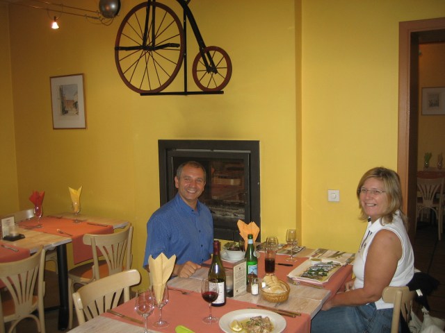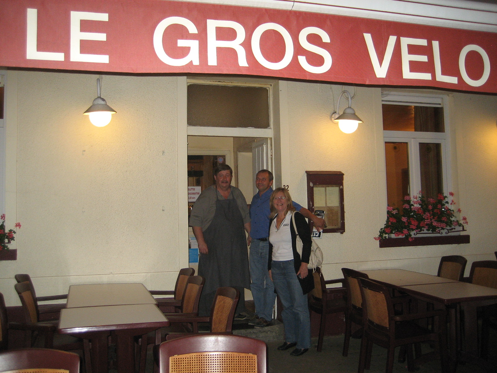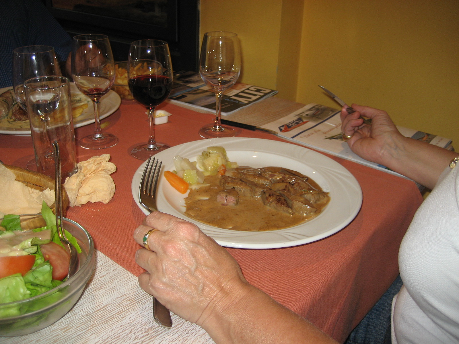 When we arrived they were closing for the day so I really didn’t get to see much. She called Francisco and he met us at Waterloo then followed us to a nice country Restaurant called the Big Bike. We were the only guests and ordered a bottle of wine to sip on the terrace while awaiting our order of Pig Cheeks and Lips in Salad, Brains in wine sauce and Razor Clams. When that arrived, we feasted in the dining room while sharing our meal. I ordered the Brain but never before had them fresh. It was fabulous. The Pig’s Face was served with chopped dill Pickles on a nice bed of butter lettuce and a vinaigrette dressing. The Razor clams were steamed in wine with a garlic and parsley sauce. Next course was Chicken Big Bike. A half chicken steamed in Garlic and wine with Celery, Onions, and tomatoes…very fresh and very good. Also, Genevieve ordered Calves Liver with Vegetables that came with a tart sauce made with fresh limes, Creme Fraiche, and the drippings from the Liver sauteed in butter. To die for! Francisco ordered the homemade sausage that I think Chef Katherine ground fresh while we were waiting. It was also great and served with a rich white wine and cream sauce. I ate a Chocolate Mousse and we left after talking to the owner Michele and his wife Chef Kathrine.