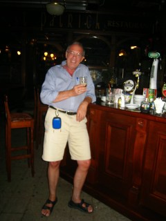 The Bazzar was across the street so the afternoon was spent wandering around the stalls and through to the adjoining Flea Market then on to the bus station to get his ticket for tomorrow. He forgot his passport so after walking for almost 4 hours decided to take a taxi to the City Hostel and return to get his ticket. The Taxi driver was honest and friendly so after he got the 8:30 am departure to Sofia , David was dropped at the main square for great coffee at the Triump Barrista Bar. The London Bistro looked interesting and a change from where he ate yesterday but after waiting 5 minutes at a table he returned to the Hotel terrace where he ate the day before and had the same waitress serve him what had to be a pound of pork grilled and served with a cognac sauce. David had to stop at the Irish Pub for last call. He found the same taxi driver that took him home the night before and returned to the Hostel.