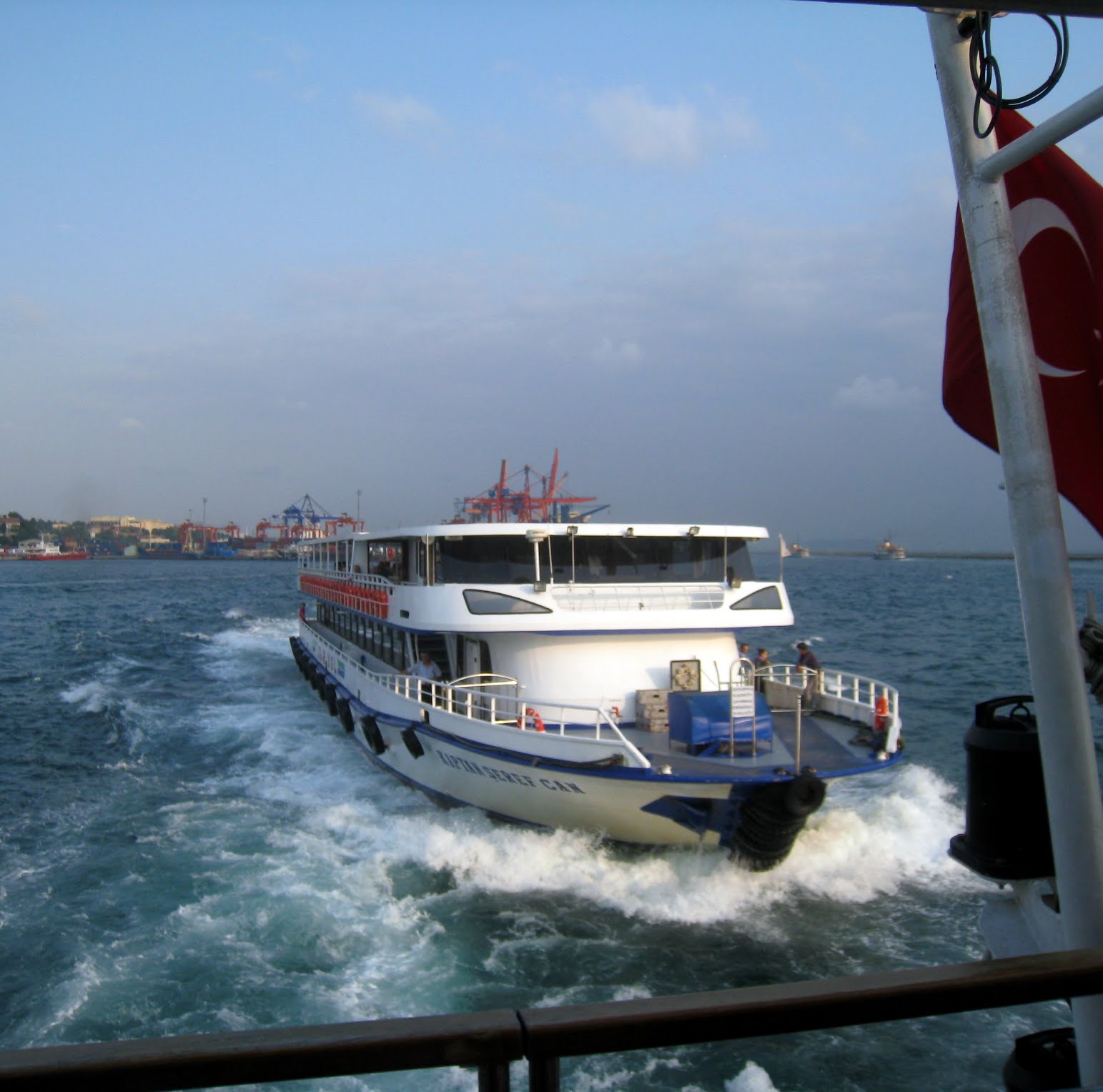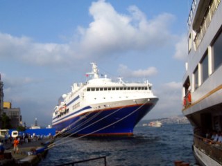 I got to the dock, I paid a dollar, jumped on the departing ferry with the crowd .  I then realized this was not a taxi to the other side but a trip to Nantucket.  It was early and pleasant the for $1 a great ride.  The air was cool on the water and the ferries and sea buses were going back and forth  like Venice.  Just not mine.  Mine crossed the Strait of Istanbul from Europe to Asia .  I panicked when we arrived and everyone rushed to get off to get the train to Syria or something.  I asked one of the crew who explained they will eventurally return to the original starting point so just relax, stay aboard and enjoy.  I did .  All these ships were state of the art with wide screen TV , in Turkish, snack bars, multi levels, clean and great facilities.  I did return and decided to take the Tram to the Sultanitina or some big tourist attracted across the water in one of the main centers of Asian Istanbul where I might find a hotel.