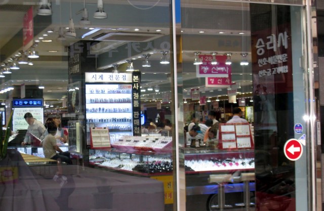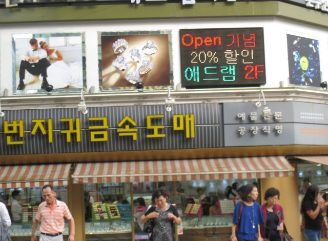 The area I was in was loaded with jewelers. It was a diamond and gold mecca where women brought there men to choose their wedding rings. Korea is Christian for sure. Their are a lot of Evangelists here and weddings are performed in mass theatrical spectacles. I have never seen so many large , huge jewelry shops in one place ever…and they were all busy!
