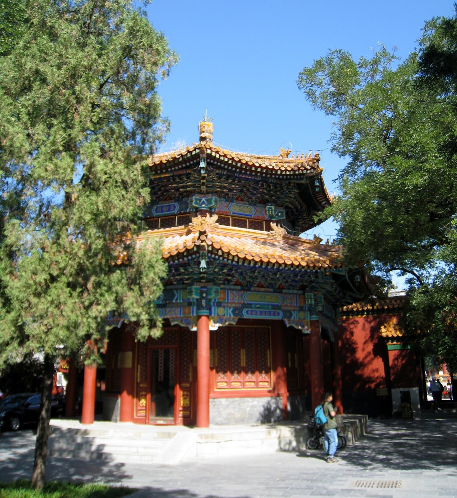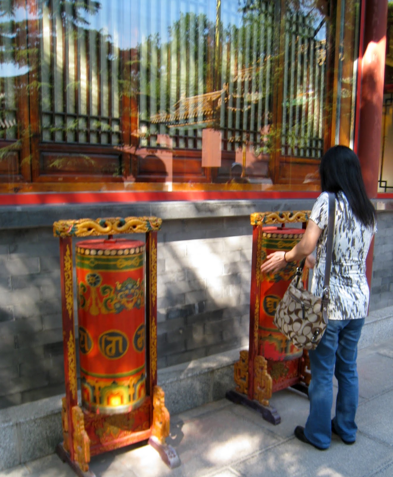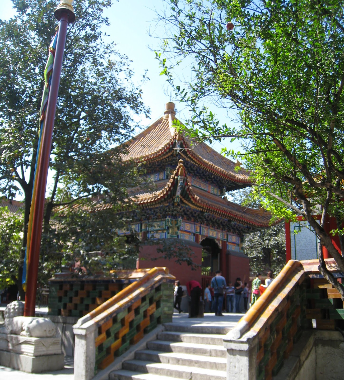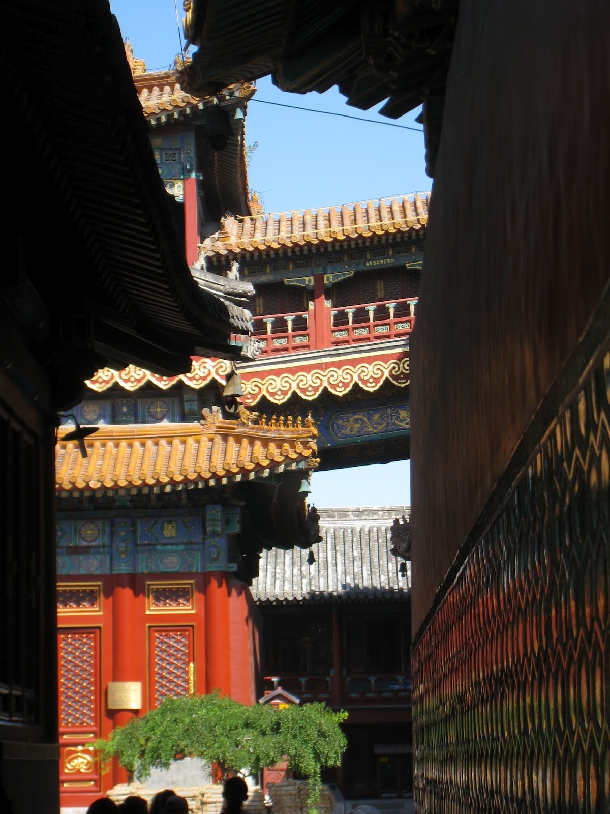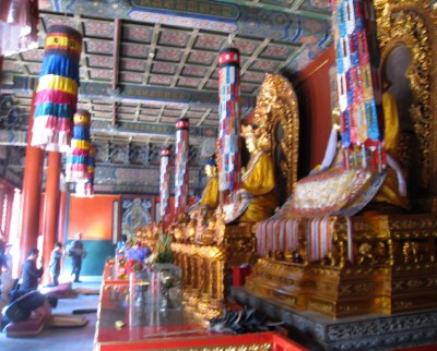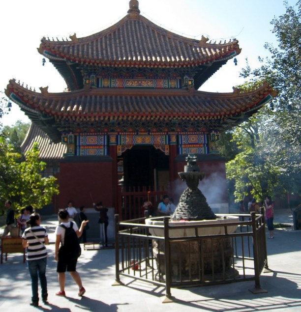 I still had taxi fare to the airport and didn’t want to take any Chinese Yuan with me so was trying to withdraw the minimum amount to get me through the day with snacks and kleenex.  The machine that I had used before only gave me one choice…balance.  I had about $150 left in cash but wasn’t offered a withdrawal.  OK it isn’t 9am and the back isn’t open yet so I went to the 24 hour ATM next door that I had used before…invalid transaction!  Oh Oh..have the police checked the guards and found a strange forgiener was staying in the building then checked the cameras at the ATM’s and saw a tall American withdrawing money…then  checked the time and the machine to determine the account…then put a stop on all withdrawals???…then…Now I’m getting more nervous.  I only have to be on that flight at 7:40 pm.  Maybe I should return, get my bags, leave a note and go to the airport now.   No the maid might be there as it is 9am now.  I have my transport card with money on it to use so I’ll ride the subway until 4pm?  No…I’ll go to the Park as planned.  I did but wasn’t sure where the park was and didn’t have the map. I did get off the right stop and the Lama Temple was there.  I found another ATM and it did not have a hold on my account so withdrew about $14, stopped for coffee then paid to get a ticket to the temple.