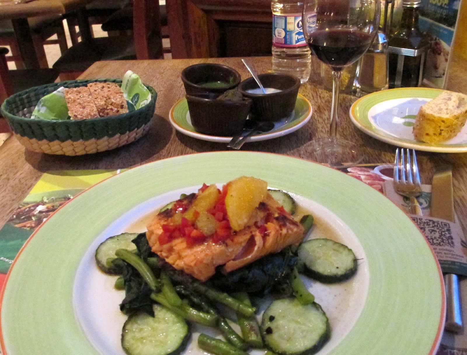 I ate at the 100% natural and had the house wine with Fresh Salmon topped with fruit on a bed of green beans and cucumbers. Cooked and seasoned to perfection. Jackie walked in so I invited her over. She had an Almond drink and a wild rice/brown rice dish with fresh vegetables. She graduated from U of C at Berkeley in the 60’s , leans toward Buddhism, studying Spanish and taking cooking classes of Oaxacan cuisine. We had a nice chat.