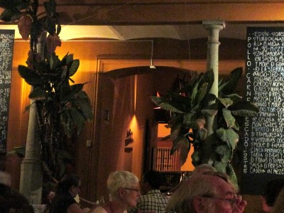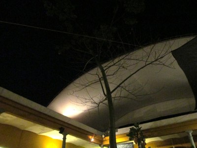 The roof was retractable and tonight was half open to the sky. A bar was on one wall of the courtyard. The menu was posted on two huge blackboards that covered one whole side of the courtyard. More decor than to read but very dramatic effect…as was all the decor. The floor was concrete but had lines embedded in the concrete so the chairs didn’t make that terrible grating sound when you moved them. The chaired were roped backs and bottoms so they weren’t hard or uncomfortable. There were NO seasonings on the table ever. No Salt, Pepper, Salsa, Sugar, anything but one very attractive candle. I liked that.