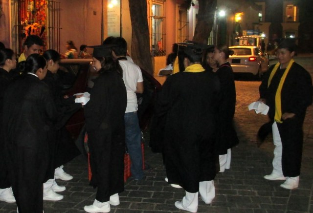 Paul and I went out to eat last night. I had wanted to try the Crespa…a restaurant and cooking school. They have a roof top dining where we ate. I tried to get a photo of another procession with a band from above but missed it. We had some appetizers and a glass of terrible warm wine they headed for Biznaga to have another glass of real wine. Paul had been there before after dark and said he couldn’t see to read the menu…it is in an open courtyard and at night it is barely lit. Tonight was a full moon and a graduation. We returned and he retired to be refreshed for an all day tour.
