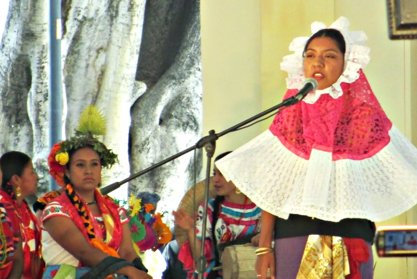 The Celebration started with a big gathering at the Zocola. Each of 8 representatives of the districts of Oaxaca (all women) was introduced and came on stage to explain the dress, culture, customs and music of the district and what made it special. It looked like Miss Mexico contest. They were decked out with the costumes so elaborate and their hair done up like movie stars.