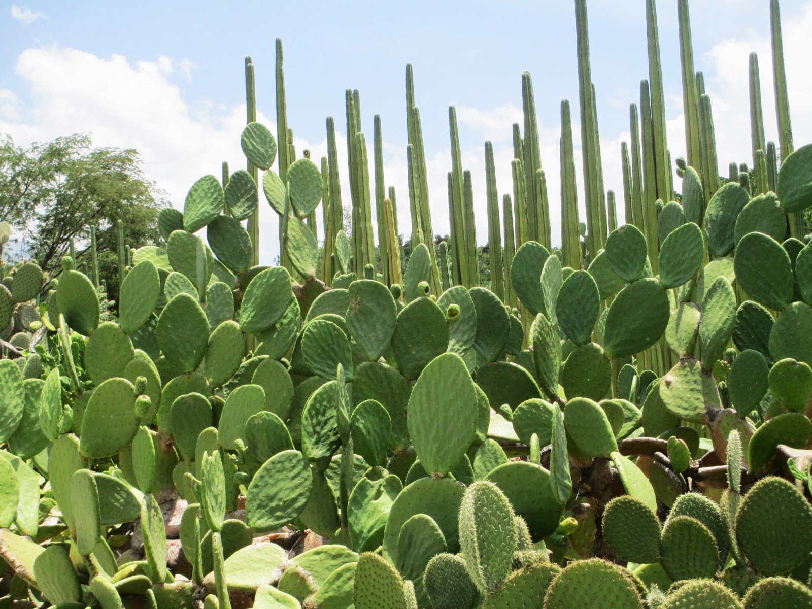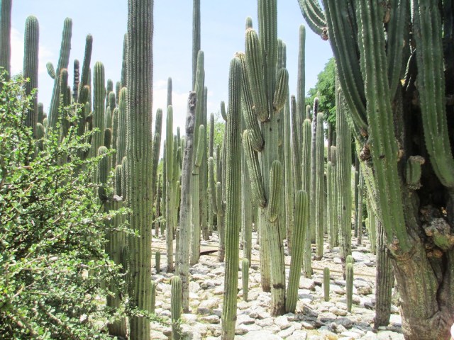 Carol guided my new found friend Jean and I on a two hour tour of the Botanical Gardens that were all indigenous plants to Oaxaca only. My thoughts of this 2 hour tour of being boring, were quickly laid to rest. Carol, had been coming to Oaxaca many years, trained to be a docent at the Garden and a gardener herself. She was a wonder and brought her classroom in a bag. She was constantly pulling out samples and charts to aid in our understanding of this complex transformation that took place after the Spanish Conquerors arrived and just from trade all over the world.