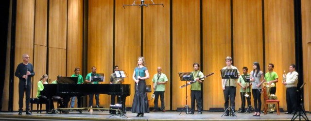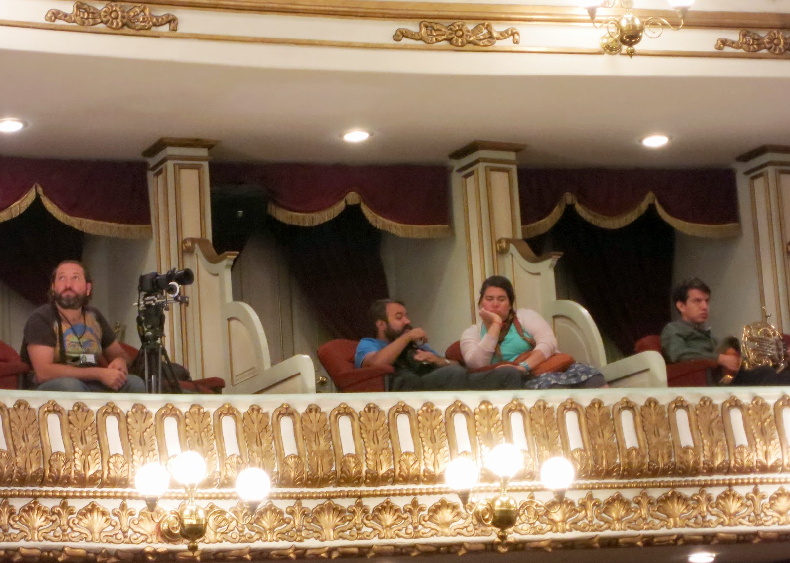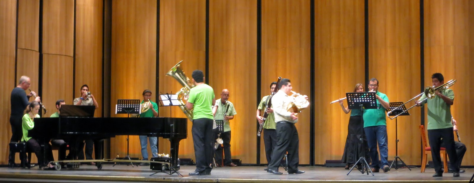 The empty stage soon filled with the players, all standing up. A flutist started lightly like a bird…then a clarinet from the balcony and so on until after about 5-10 minutes it became like 5 o’clock traffic in Mexico City on Friday. The sound came from everywhere and kept changing as the players moved around the stage. Some would face a wall then the audience, some would sit then stand, some would pick up a different instrument and put down the other, some would Mute their horns then not, some would exit left then re- enter on the right of the stage.