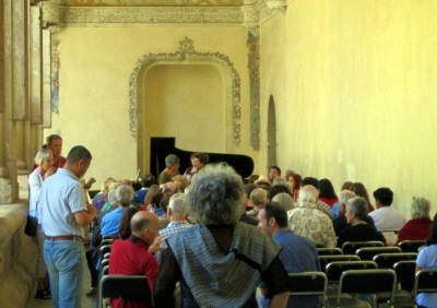 The concert in the Santa Domingo Cultural Center was filling up when I arrived on time for the Noon Concert. More chairs were brought out. These pianists were some of the world’s best and had played together before. Each took turns playing 4 different selections from Mozart to Ravel. The Center used to be a convent 100’s of years ago. The building dates to the late 15th Century. It was held in the Cloisters, I think they are called. This will give you some background on the Pianists: Alberto Cruzprieto Y Alejandro Barranon