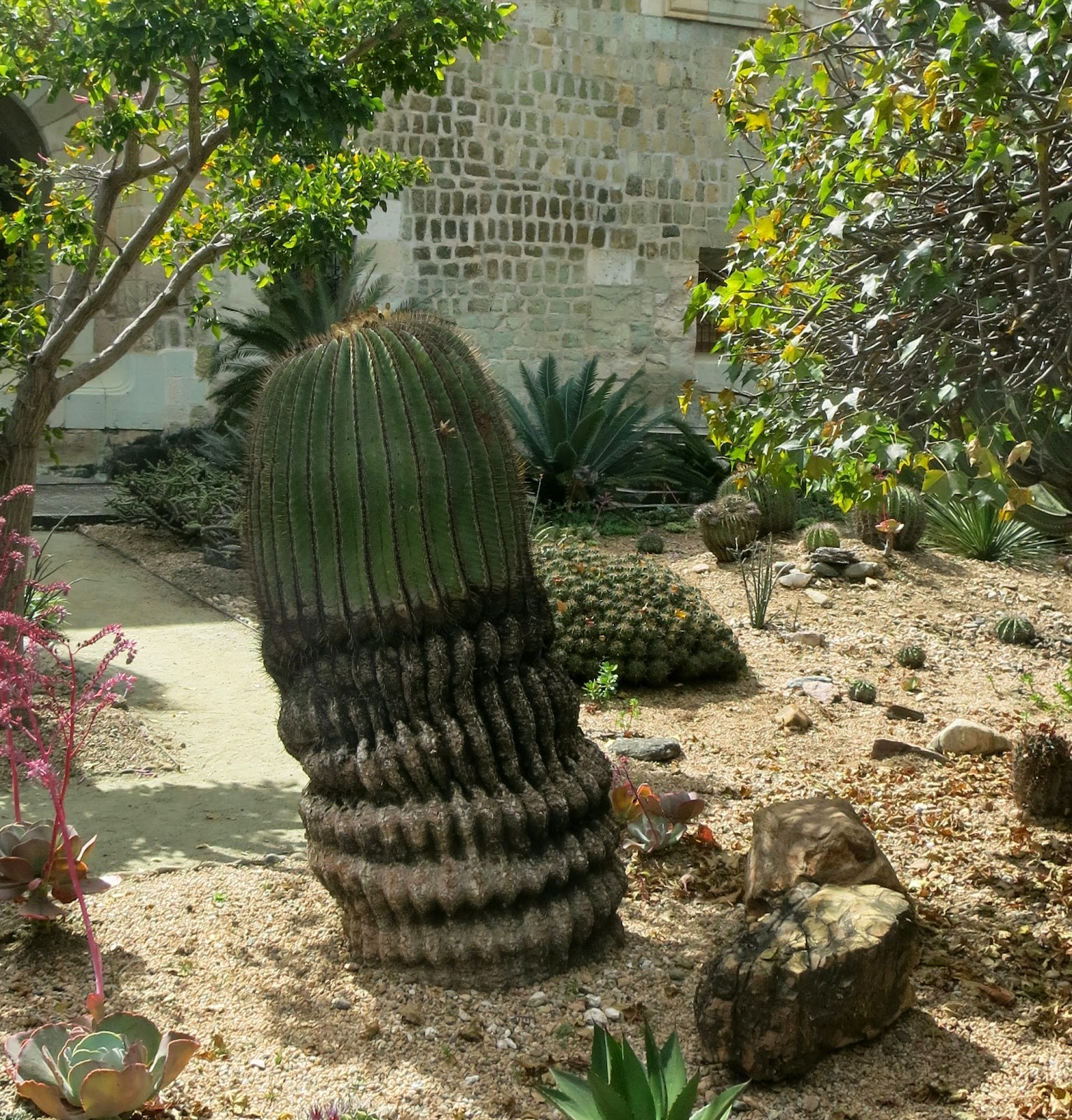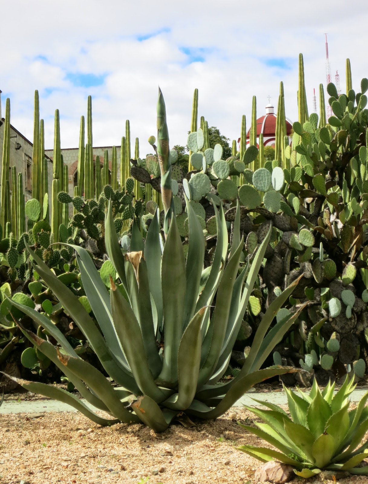 The gardens are in what used to be Santa Domingo Church grounds until Benito Juarez (shortest President ever in the history of the world) took the church property for the state and the people of Mexico. In 1994 it was a military barracks and compound. A Oaxacan artist petitioned the Mexican Government to protect this World Heritage site…and they did. Money was funneled in and work was begun to restore the compound. The garden was set aside and plants, trees, bushes, cacti, vegetables, from all over the state of Oaxaca were brought here and given special treatment so they could survive the change in altitude and climate.