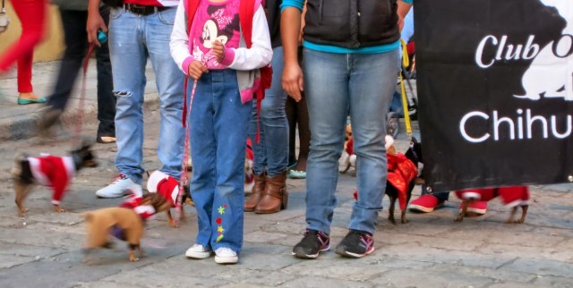First parade was the Oaxacan Chihuahua Club all with Santa Hats on including the Chihuahua dogs! Then Alaskan Huskies? or Malamutes. Following that was the band,ladies with lamps, and the head was led by a man carrying the equivalent of a entire trunk of a tree like the Scots do on Highland Fest.