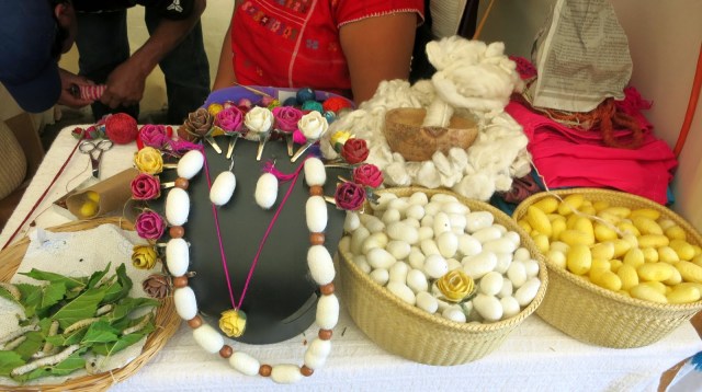 | Real Silkworms…Silkworm Cocoon carved into a Rose and Necklace Made from Baskets of Cocoons |