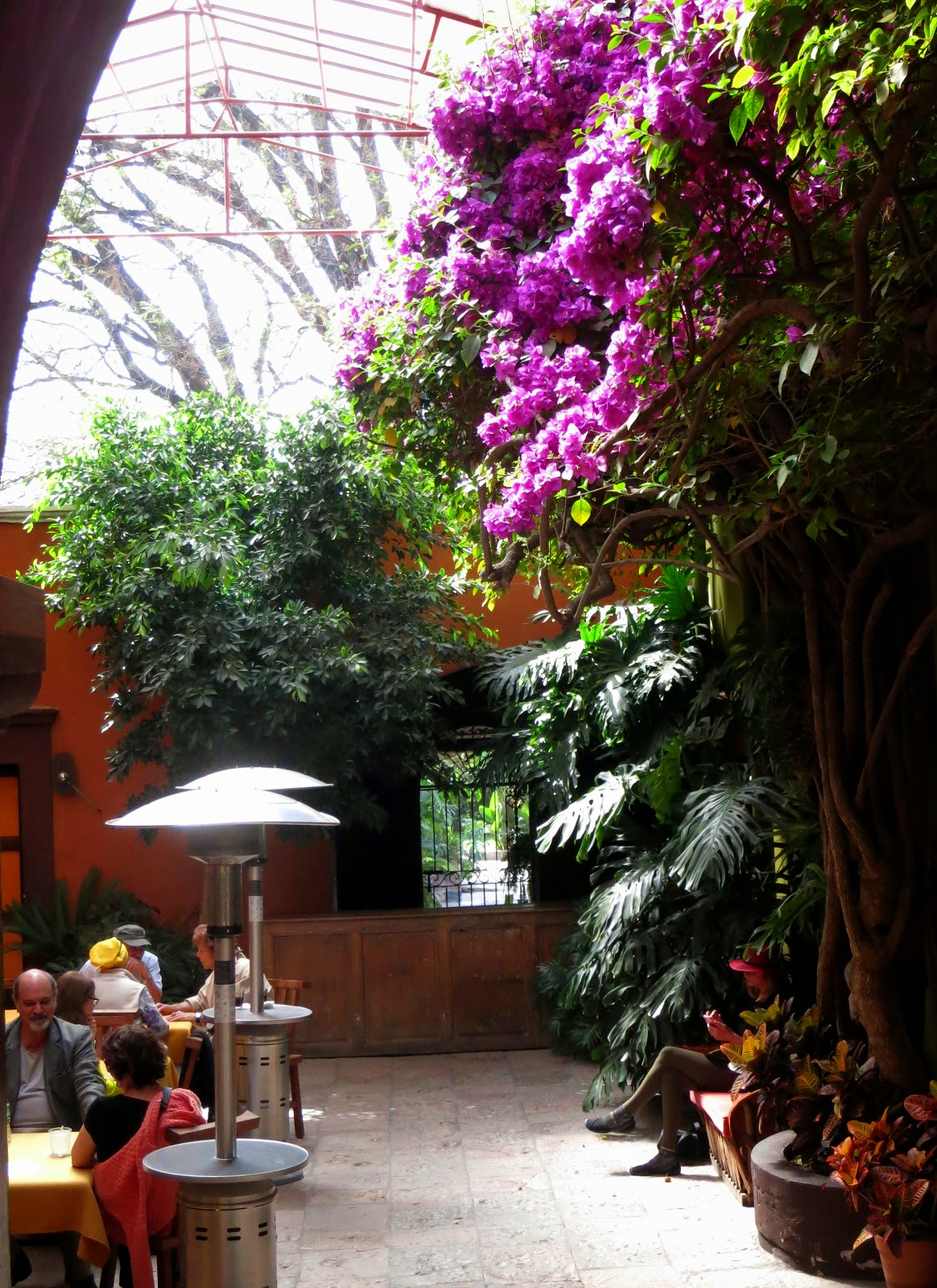 I returned to BERLIN for some Baked Brie and small salad to start. Then I had the Lamb Chops Special…which was’nt…and Roasted Veggies. Finished off with a Chocolate Souffle and Ice Cream, Royal Porto and decafe. A lovely Panamanian lady from Chicago sat on my left. Her husband sent her down to SMA to get warm. Her mother was going to join her later. She wants to move to Oaxaca next year. To my right was a man from Seattle joined by a lady from Vancouver BC. They both lived in SMA for quite some time. She had 12 birds, 5 dogs and I think a couple cats. They got a table for dinner and a nice French couple from Normandy replaced them. Francois and Ana had been to Scottsdale and played golf at Troon. They had visited Oaxaca and said they loved it and hoped to return next year. David joined me just before we left. He is the world traveler that has lived in SMA for over 12 years. His wife is Mexican and she teaches in San Antonio where they raised their children and have a home.