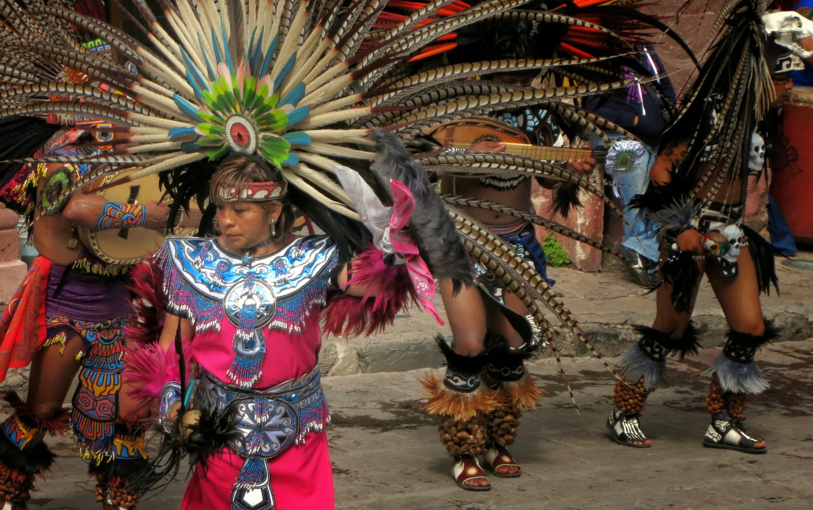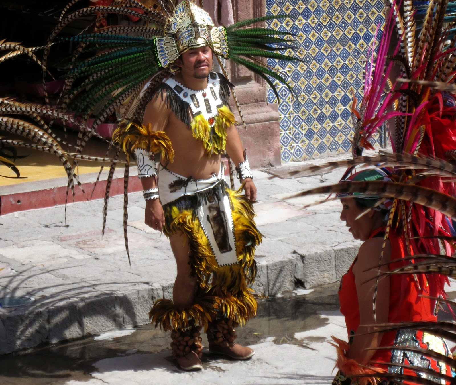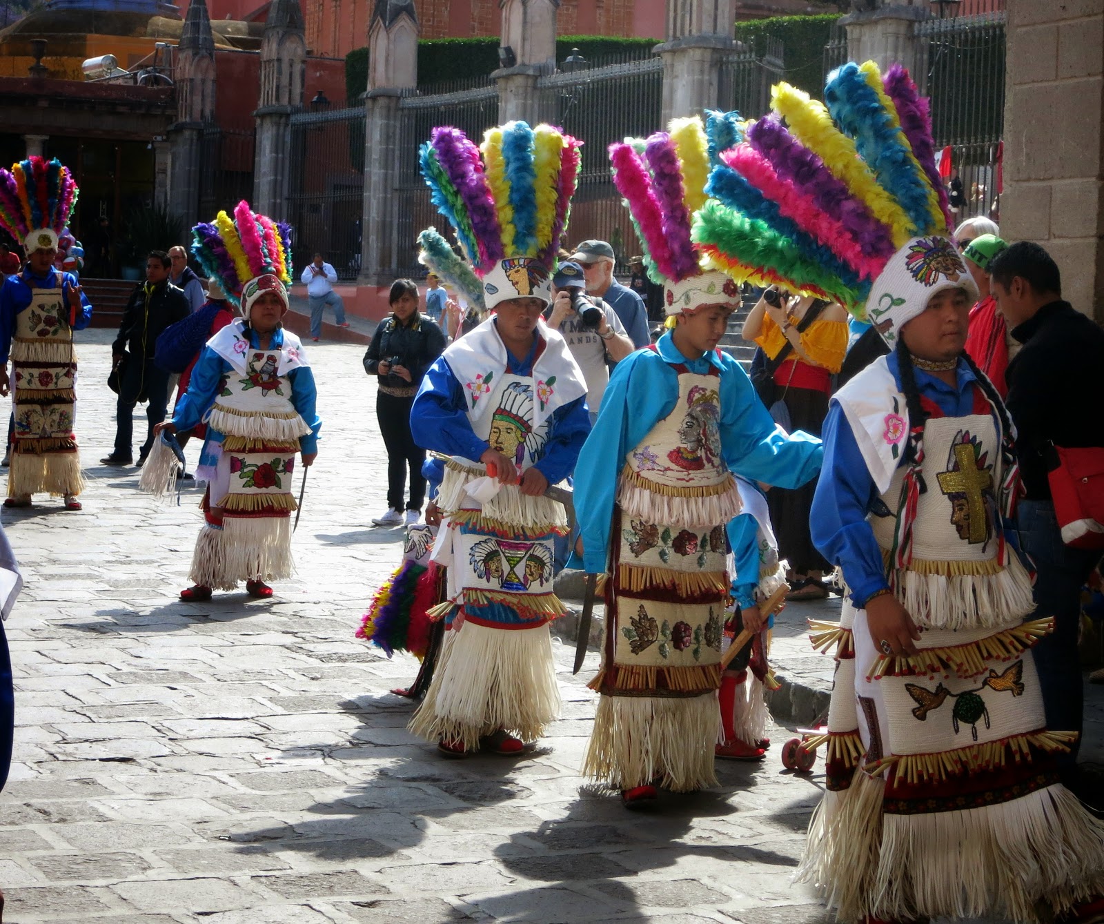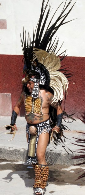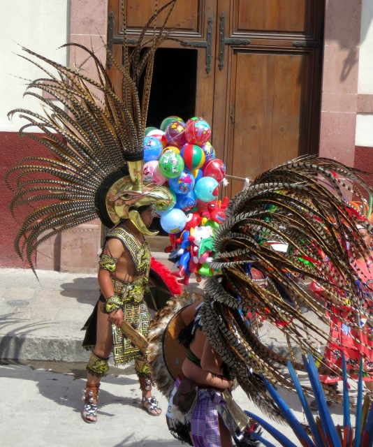 The Mayan Dancers, over 100 of them were marching to the Jardin to dance around the square. I had lunch nearby and when I returned home for Seista they were still dancing after an hour and a half. Beautiful costumes if you call them that.INDIANS DANCING