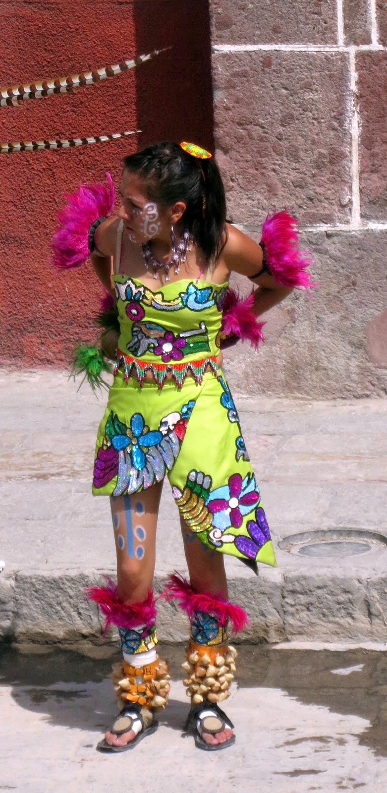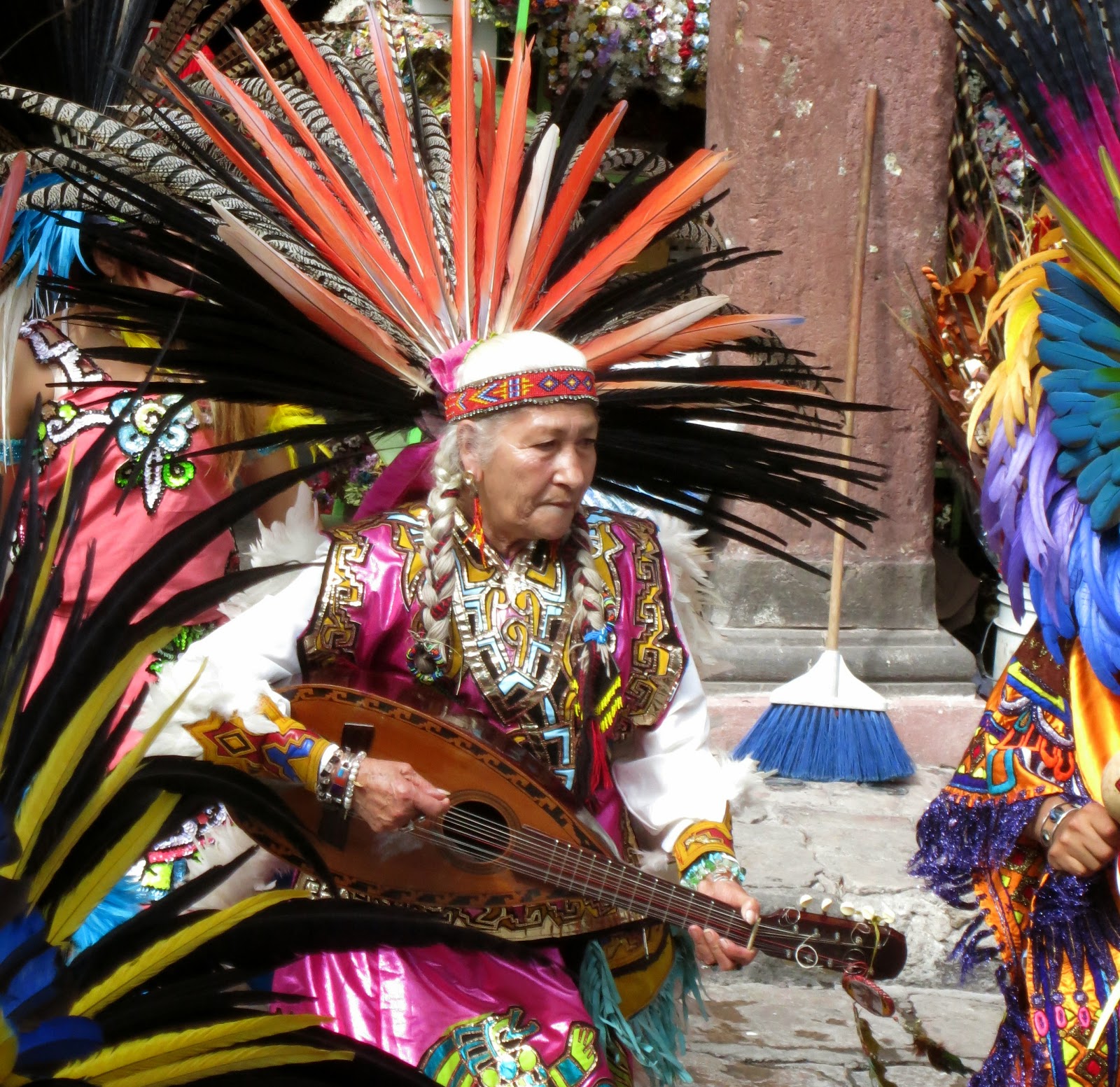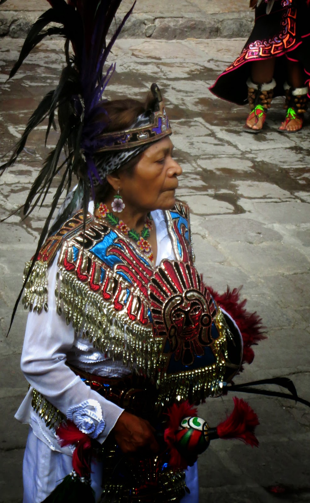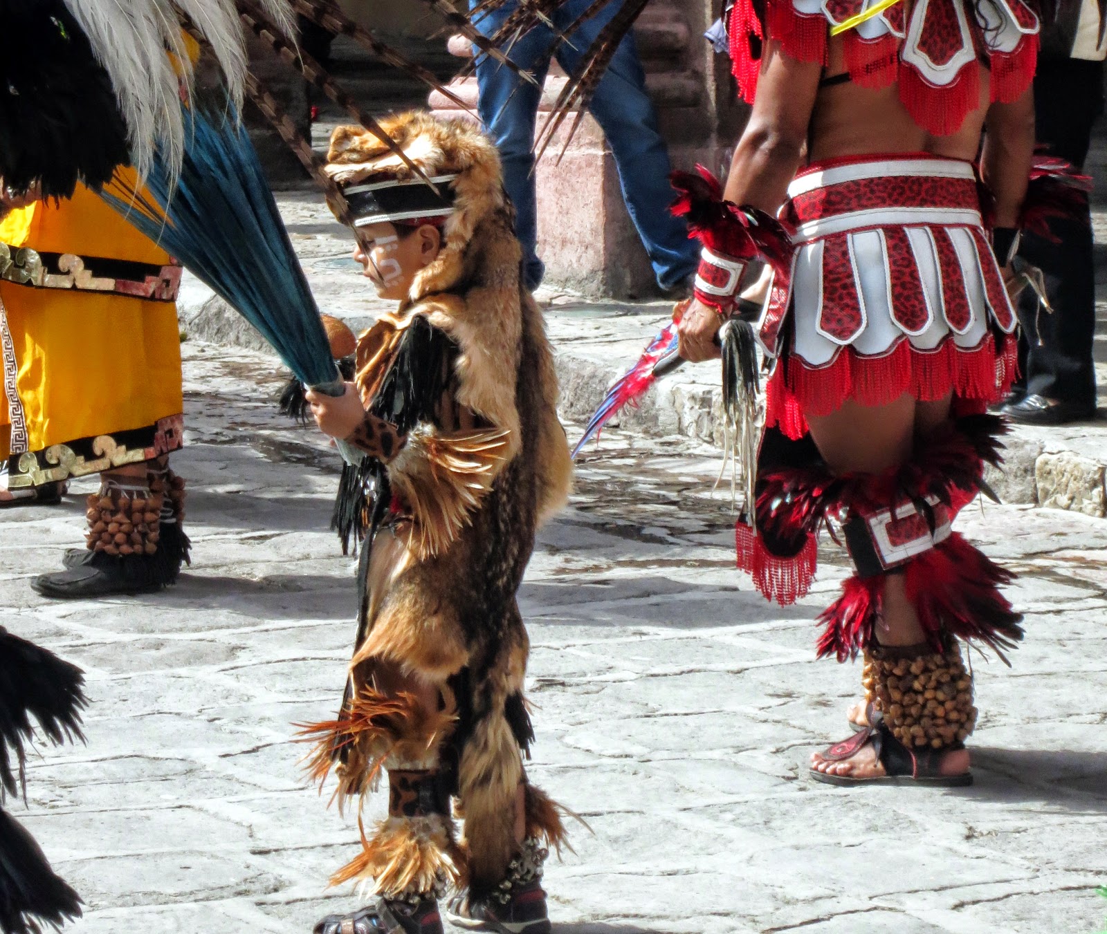 The Mayan Dancers, over 100 of them were marching to the Jardin to dance around the square. I had lunch nearby and when I returned home for Seista they were still dancing after an hour and a half. Beautiful costumes if you call them that.INDIANS DANCING