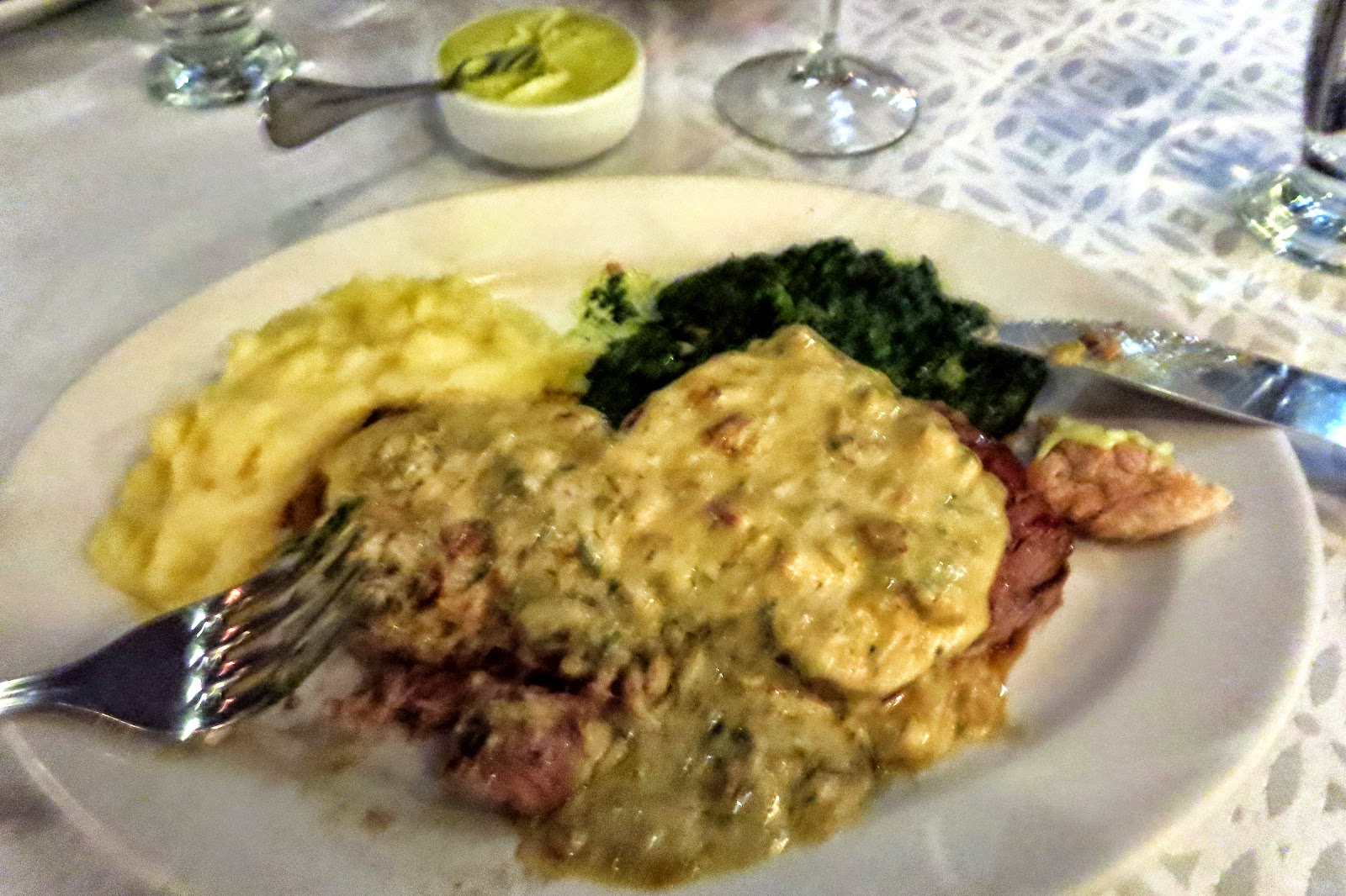 It was around 6 pm and Richard hadn’t returned so I left a message that I would be dining at BERLIN and took a taxi there. I arrived to a packed house so got seated in a small dining room off the bar area and ordered some Casa Vino Tinto with Tilapia crusted with grated potatoes, a side of German Saurkraut and Dill Sauce. German version of Fish and Chips with Slaw and Tartar Sauce.