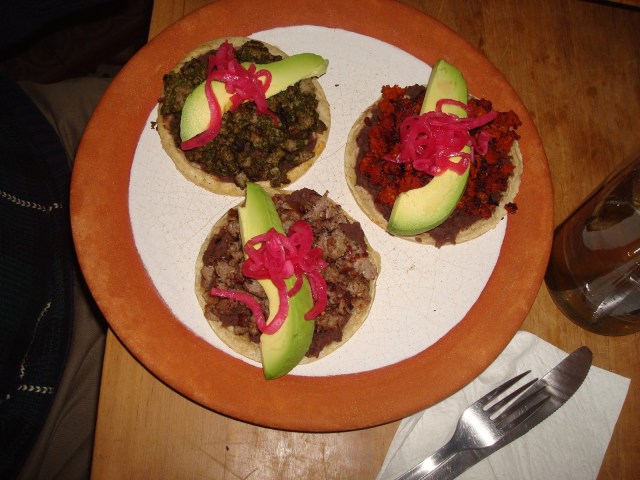 Helen had a Turkey salad, and I had Corn Soup and Memolitas (Little Tortillas but crimped along the edges basted with lard then refried beans with a little spice…all topped with Chorizo on one, Pork another, and Chicken on the last then all topped with pickled red onion and fresh avocado)