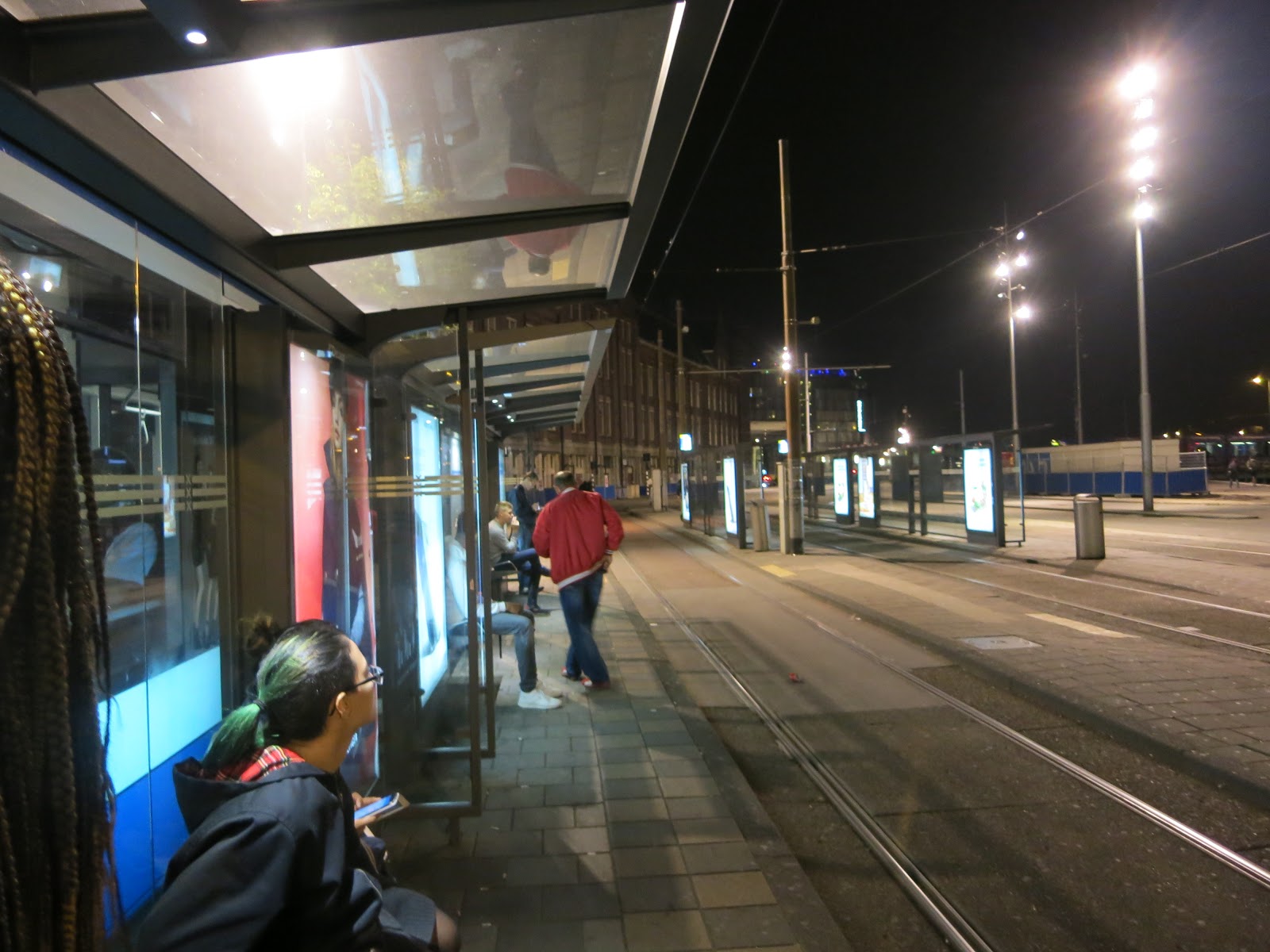 I bought my ticket but while waited for the train, I realized I forgot to have it stamped at the entrance to the track so ask this kind gentleman to watch my bag a minute and hurried upstairs to the entrance, stamped the ticket and returned to watch our train leave without us. I felt bad for the guy but we took the next train but my stop wasn’t on that train so had to go into the center of Amsterdam then take the Tram to the apartment. I arrived after Midnight but they were waiting to greet me. We had a drink and I retired to my room to discover a bottle of wine waiting with my hash pipe and hash from 3 years ago. Some things never change.