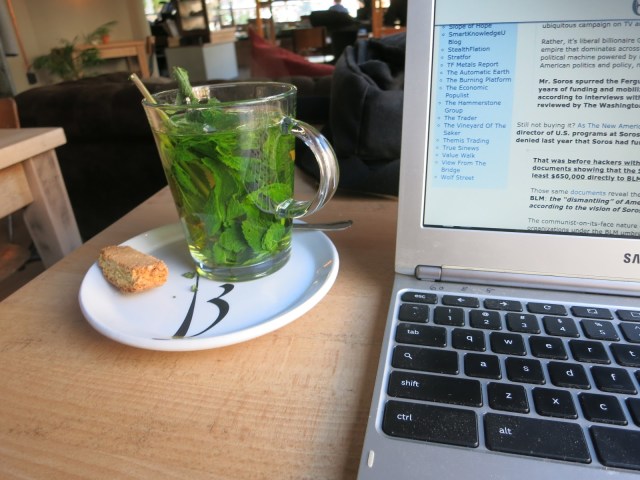 Then crossed the street to the Saturday Market but after bumping into people and not seeing anything that interested me I returned to get my computer and headed for my “office” across the street for some Mint tea and play on the computer while listening to Bob Dylan, “Mr. Tambourine Man.” and a great music sound and selection.