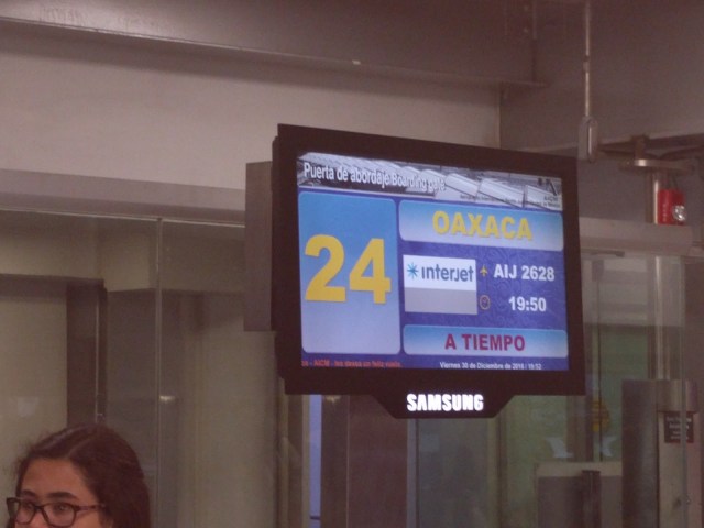 Great I walked another 2 miles to gate 27 with two rest stops in between to relieve my cramped legs. I was hour and a half early so sat in front of the desk and started reading when after about an hour I realized the flight number on the screen changed. I approached the desk and showed them my ticket and asked why the change when he pointed out there was no flight to Oaxaca from this gate. The flight number now referred to Bogota, Columbia. My flight disappeared on all screens. There were others that fell prey to the same deception so we formed a co-op and pooled our resources. Richard spoke good Spanish and checked his American Airlines web site hoping to get info, the lady was from Mexico so she went to Interjet Desk to inquire and I sought out the Information Desk. We were all told gate 21 so we left with me trailing way behind. No one was at 21 and was told 22 so went back to be told 23…where I was told 24…and there we all were told the plane was delayed out of Chicago and would be an hour and a half late. It was.
