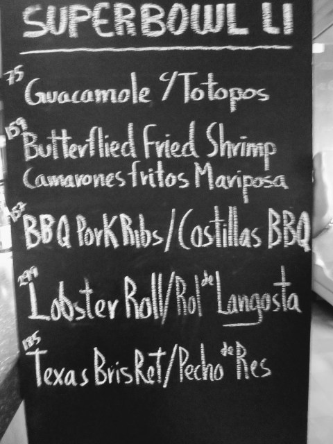 I never saw this restaurant so busy ever. The owner came over and apologized . I did understand having been a Chef and Owner so happily accepted his offer of a Mescal after my bartender also poured me an extra wine. The game went into overtime and New England stepped up to the plate and walked away with another awesome win. It was the most fantastic Super Bowl ever.