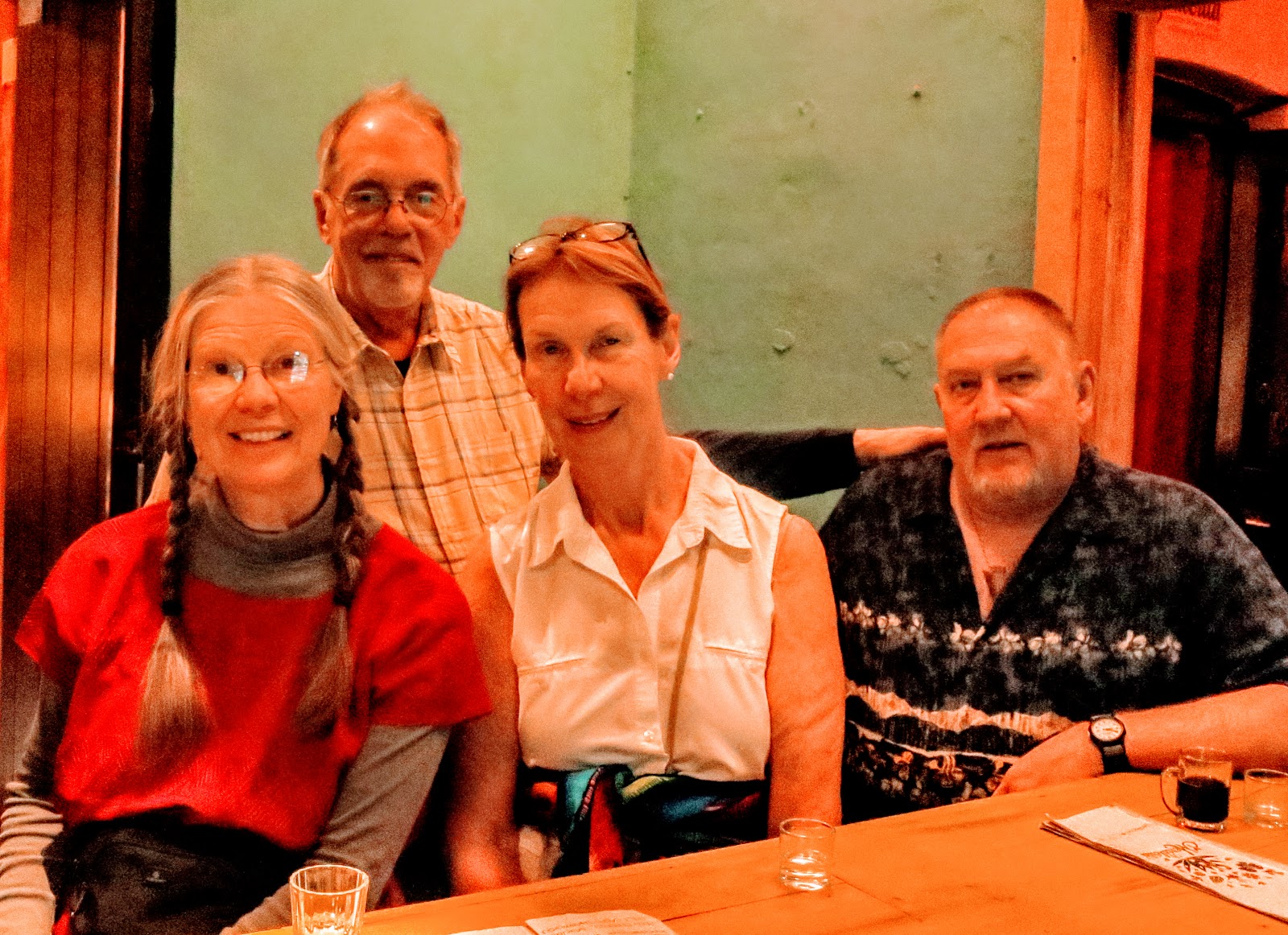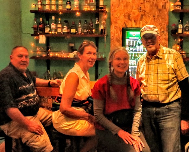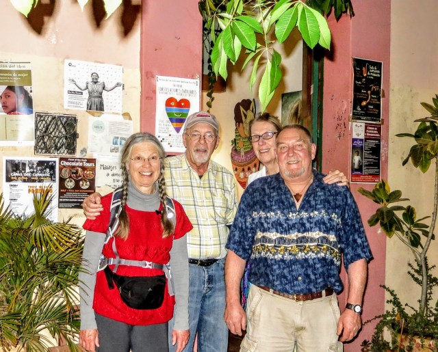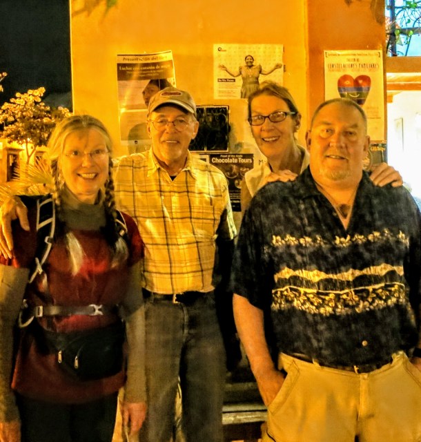 Monday, Monday….Dinner with Sandra, Lynn, and her husband Kurt at the popular Quinque Restaurant. I brought some box wine for us as they do not have a liquor license. Just after I arrived so did they. It was a packed house so we ate upstairs. They had the Shrimp and I had the Fresh Shark. It was all good but I forgot to take photos again. I caught my friend Peter as he was finishing his dinner and enlisted him to take a photo of us.