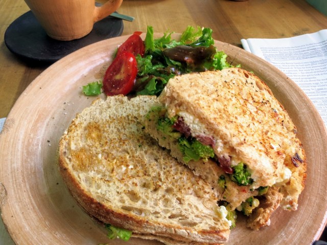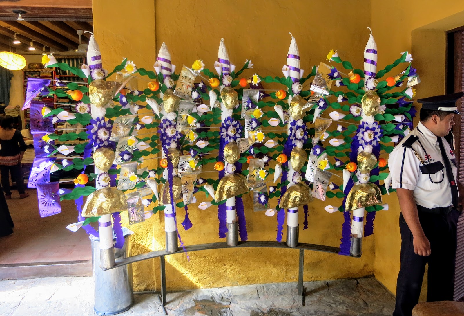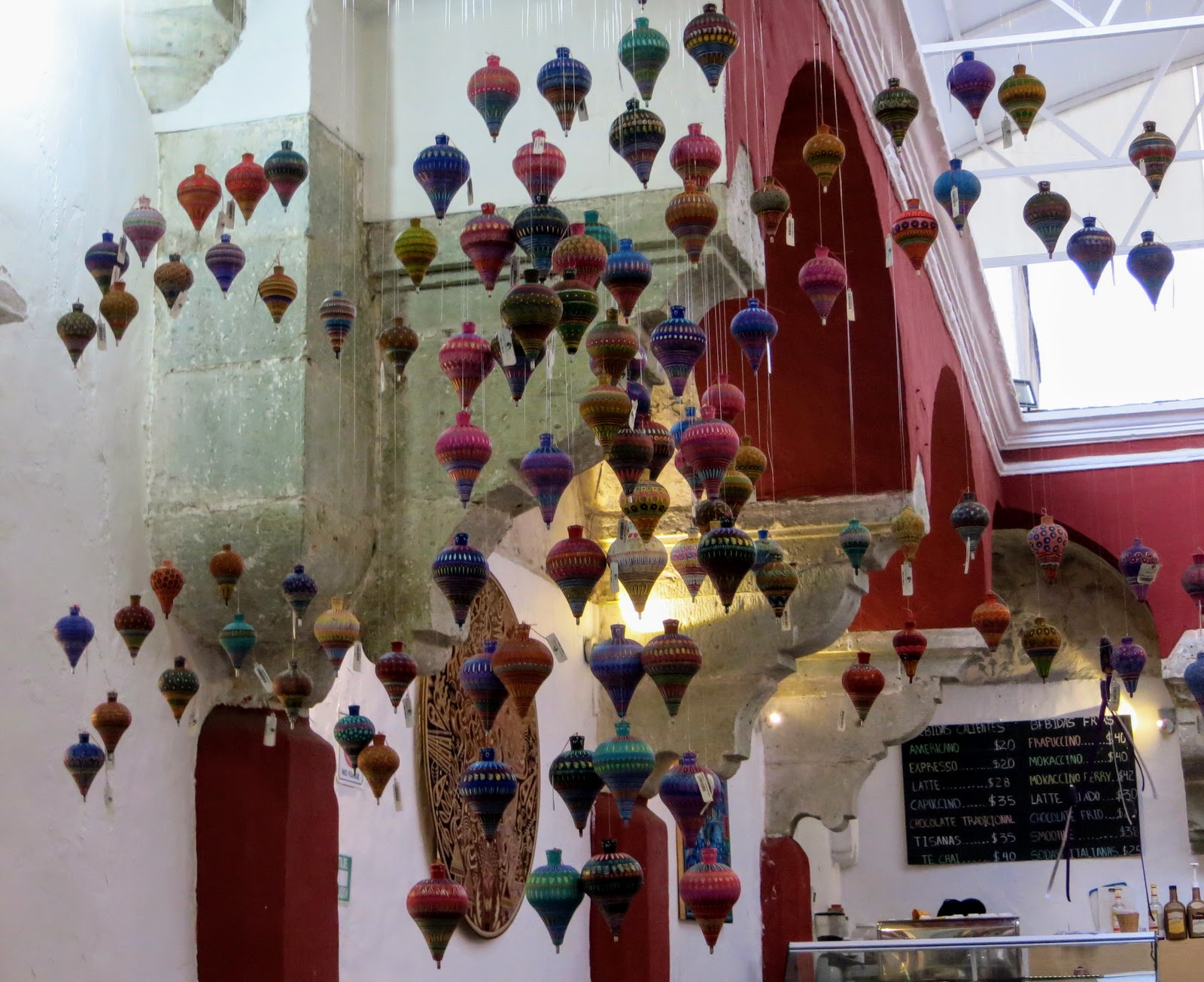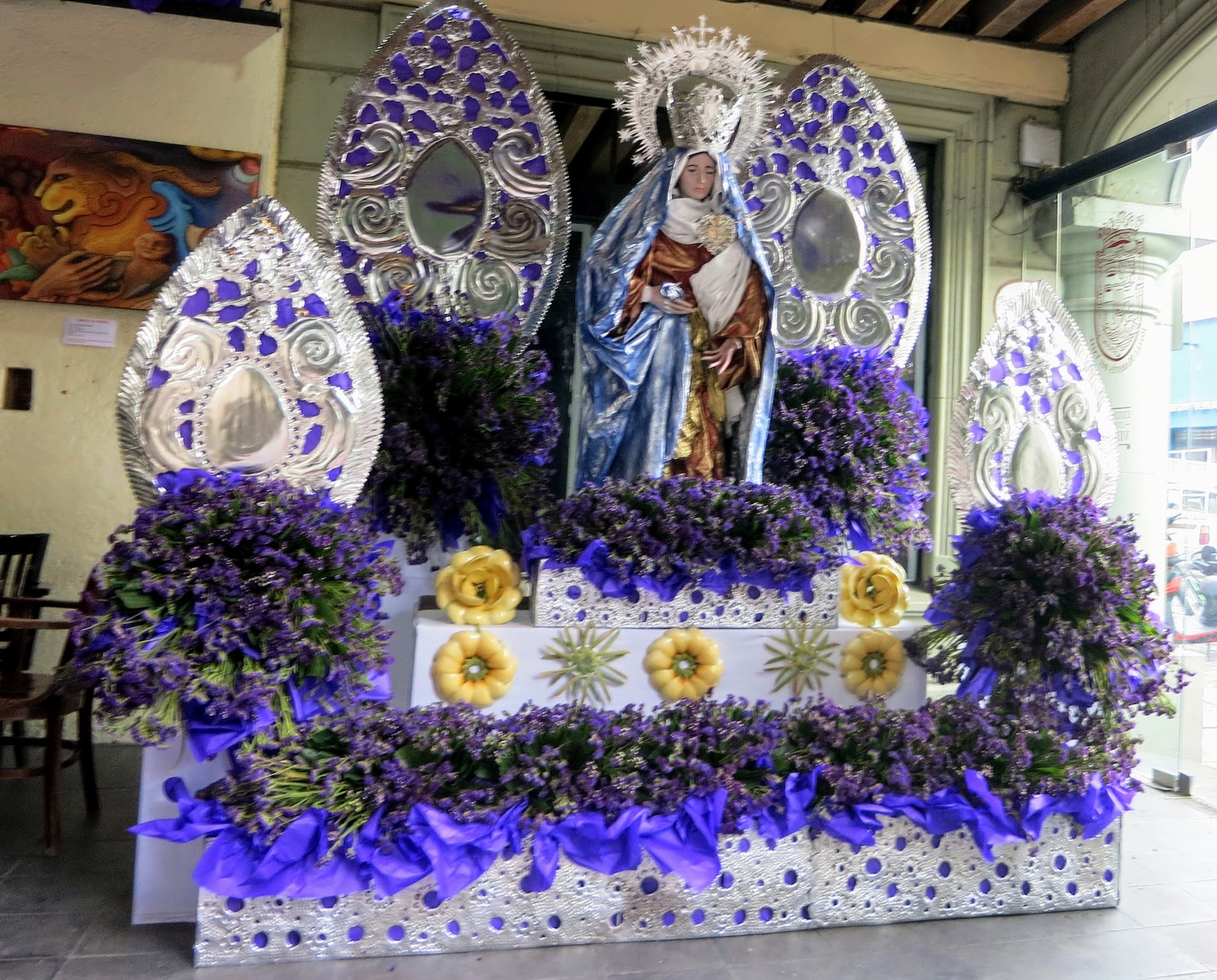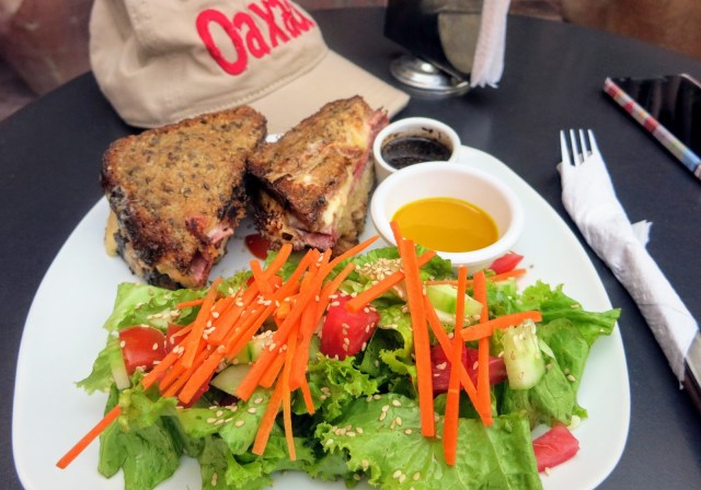 So about 6 pm I headed for the Zocalo and an Art Exhibit. I took some photos of the Easter decorations. Everyone was in town for Holy Week. I ended up at the Gourmand Deli. I stopped there a couple days ago and felt I had to try it before I left. Deke told me about the cheese selection they offered in the Deli to go and when I asked about the Feta I saw on the menu the owner came out to help me. It was the same women that sold me those delicious Home made Turkey Sausages I bought at the Market last month! I went back for more but couldn’t find her again. Now I know where to go. I had a Reuben Sandwich good but not impressed. I took half to go and headed back when the rain was still going…more of a drizzle.