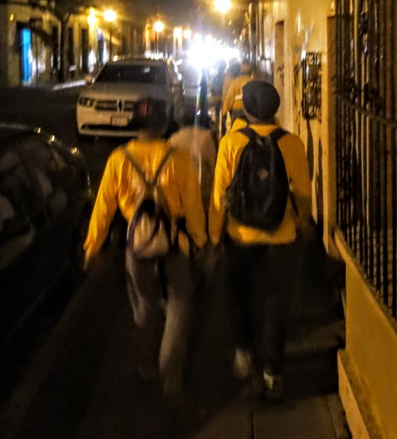 I crossed the street with a group of about 20 people with yellow T shirts on with luminous writing on the back. I thought they were a family until I read the writing…something about a Walking Club or group.