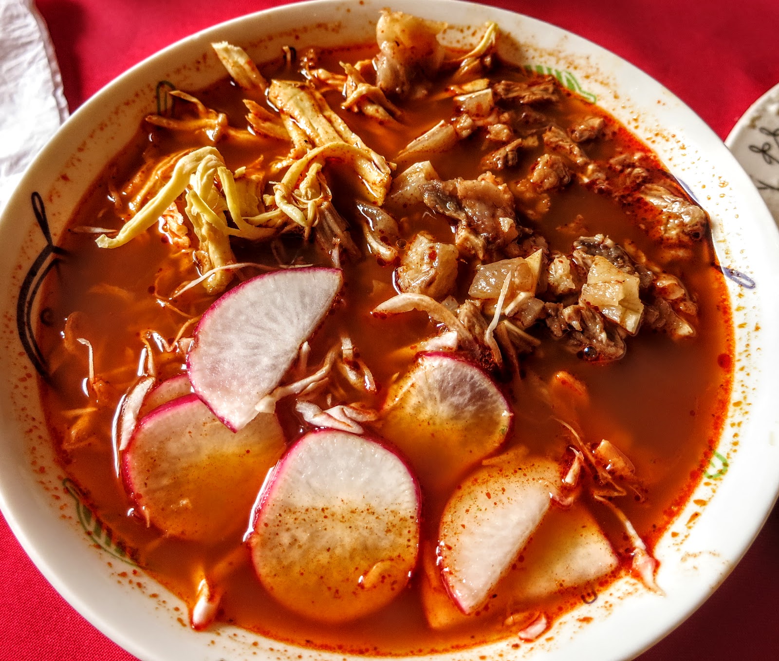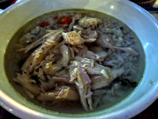 We had a Comida Corrida at Sabor Restaurant across from a grocery store where I bought some canned corn for my Pot Luck Salad. The comida is a three course meal with a beverage. It cost 65 Pesos, around $3.50 and you have a selection of 4-5 entrees to choose from and soup or salad with the dessert at the end. We had the Fruit and Vegetable Salad…which was a meal. She had the Chile with Cheese and Rice..I had the Pozole Corn soup with Chicken and Pork..We had Poached Pears for dessert.