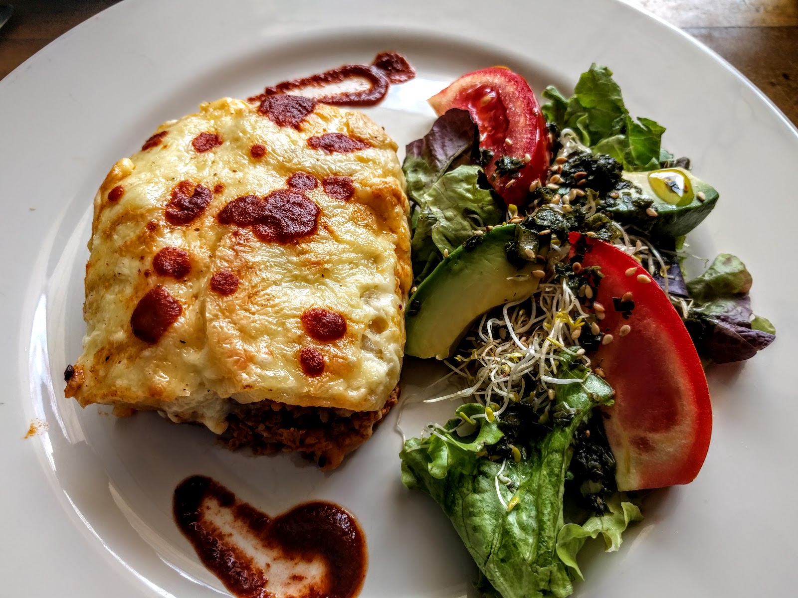 Today I visited Biznaga for their Comida of Spinach Soup and a Pulled Chicken Lasagna but instead of Pasta they used Scalloped potatoes with the chicken between and topped with Cheese and a salad.