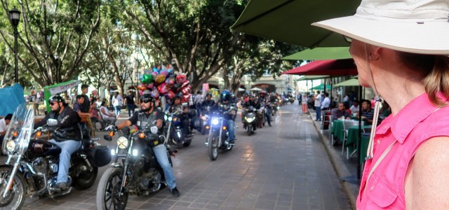 They joined me to meet Lynn and her husband Kurt for the Mid Afternoon meal at TerraNova. Kurt had the buffet and we all had a meal that entitled us to a Half Bottle of Wine each while Kurt stuck with his beer. We had a nice meal then left to return home when a huge group of Bikers stormed in and started circling the Zocalo. It was the “Wild Bunch” with Marlon Brando and Lee Marvin…or so it seemed. They were all peaceful and after doing about three round around the square all parked and proceeded to patronize the local