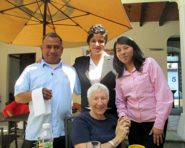 I met a young family at the bus stop that lived in the states for four years. The young lady and her sister spoke English fluently and were friendly. Daddy had his arms full with a baby. I hopped the first bus and was at the Zocalo in minutes sipping a latte listening to listless jazz on a Sax played by an elderly gentleman…my age. I felt energized and walked across to a small grocery store but no towels or detergent but there was Kay with a group having her coffee. I introduced myself and they invited me to join them for dinner at the newly opened Hotel Parador. Gary and Coral from B.C. Canada knew the Chef and recently discovered this gem that took 14 years to restore to it’s glory. It was elegant, with fountains in the center of an open courtyard and a second level balcony surrounding the dining room with an open sky above the courtyard. The Chef greeted us and a waiter promptly sat us in an empty dining room. I perused the menu to discover some amazing dishes and CHEAP prices. The Chef , from Mexico City, trained in Santa Barbara, Florence , Genoa, Madrid before returning to Oaxaca. His father is Italian so he acquired dual citizenship for Mexico and Italy which allows him to work and travel anywhere in the European Union. His plans are to leave before next year and open a restaurant in Europe. My Shrimp Cocktail was not enjoyable…to sweet and poor quality shrimp…plus the presentation was not professional. The salads for the ladies were very nice and well presented. Gary’s Spaghetti with side Veggies was well done and he said great. My Chicken Cordon Blue with Tamarind Sauce never came until they were almost done. It was dry and overcooked with no cheese inside that I could tell. The Sauce was superb. I rushed through it because they were finished and looking at the bill. I would go back and will but will order more Italian…which he seemed to do well.